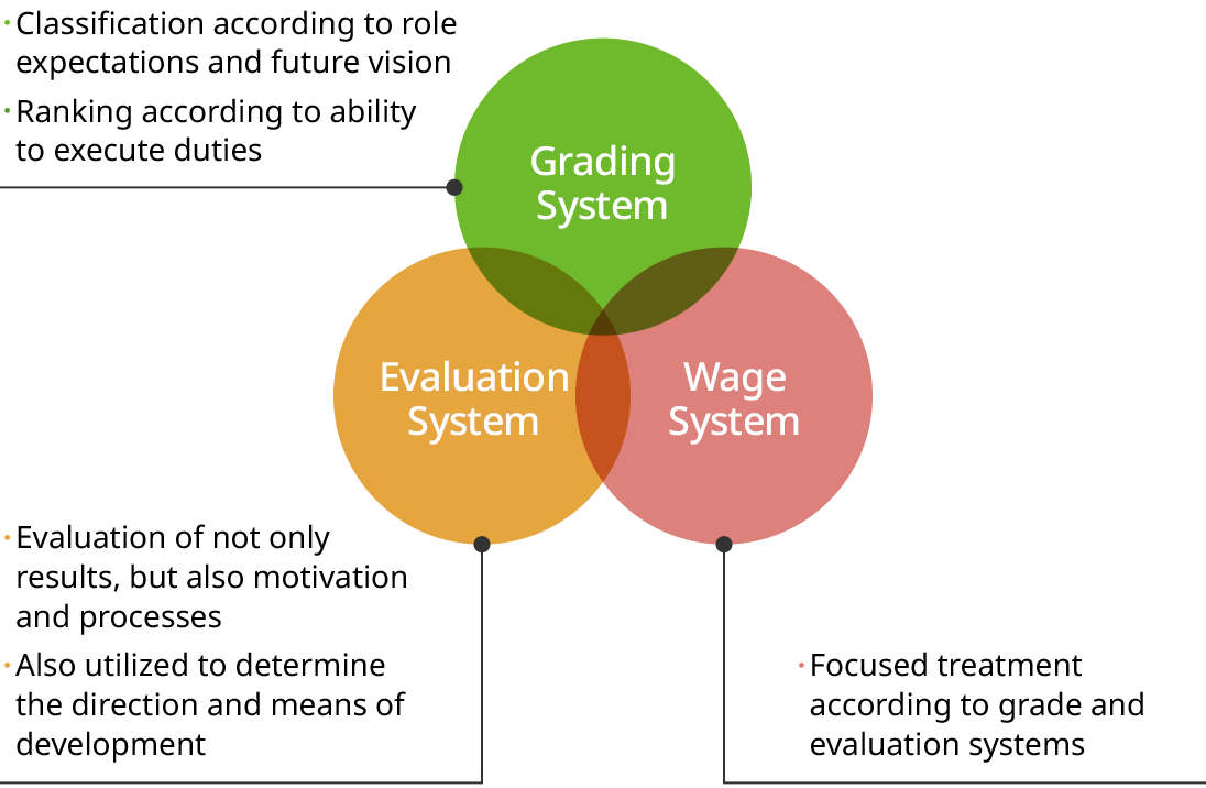 The personnel system is characterized by individual management based on the aptitude, skills and goals of each person, with emphasis on human resource development. Specifically, this is made up of three components: a multi-stream vocation qualification grading system, an evaluation system, and a wage system clearly linked to these. We support all employees equally, providing them with a range of career opportunities in line with individual aspirations that meet their individual roles, achievements, and capabilities.