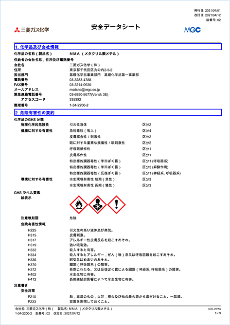 SDSs are documents that convey detailed information about the handling and safety of chemicals and are submitted to companies that handle MGC's chemicals, such as customers, sales agents, and shipping companies. MGC prepared SDSs that conform to GHS-compliant JIS (JIS Z 7253).
